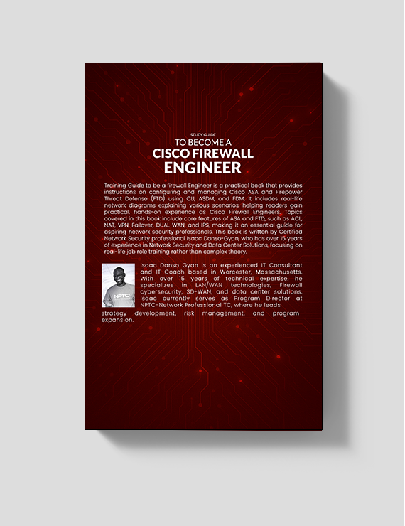 Training Guide to be a firewall Engineer is a practical book that provides instructions on configuring and managing Cisco ASA and Firepower Threat Defense (FTD) using CLI, ASDM, and FDM. It includes real-life network diagrams explaining various scenarios, helping readers gain practical, hands-on experience as Cisco Firewall Engineers. Topics covered in this book include core features of ASA and FTD, such as ACL, NAT, VPN, Failover, DUAL WAN, and IPS, making it an essential guide for aspiring network security professionals. This book is written by Certified Network Security professional Isaac Danso-Gyan, who has over 15 years of experience in Network Security and Data Center Solutions, focusing on real-life job role training rather than complex theory.